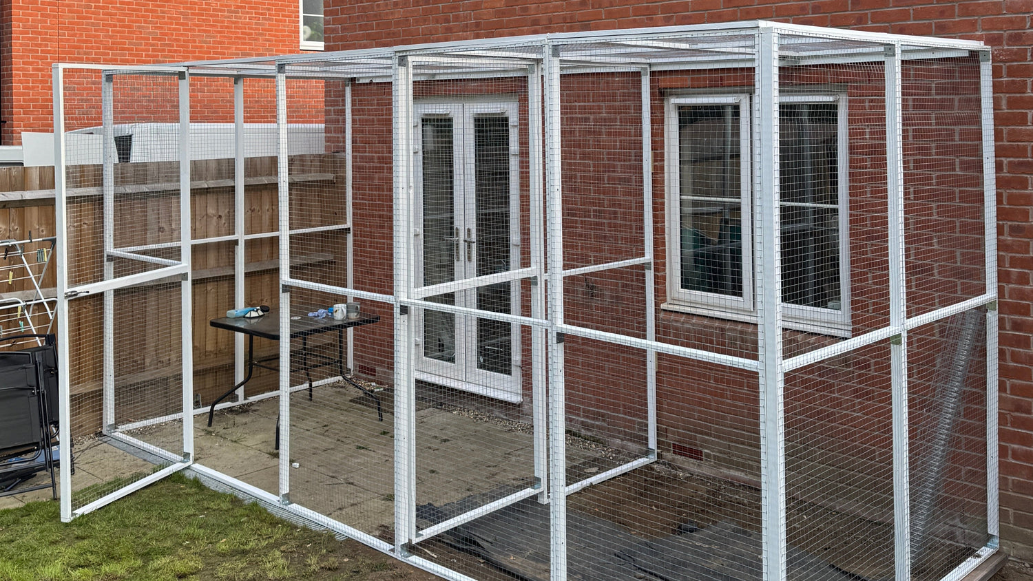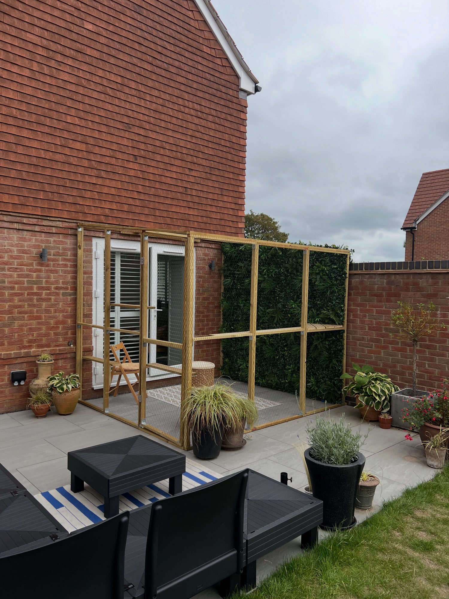 Built across the full 5 × 2 m width of the house, this elegant white-painted catio provides both style and function. Designed for a homeowner who wanted direct access from her French doors to the garden, it features an internal divider that keeps the cats safely contained in one half while leaving the other side open for outdoor use. The clean white finish complements the property beautifully and has been exceptionally well received.